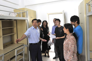 查看新生报到点后,梁书记在教务处郝旭霞处长、宣传部沈中灿副部长等的陪同下,前往润泽园新建学生住宿楼查看新生入住情况。在逐层查看中,梁书记对宿舍的整体配置和水电情况进行了查看,并详细地询问了新生的入住情况,要求宿管人员尽力为学生营造一个温馨的居住生活环境,同时他还对局部施工的安全问题提出要求。