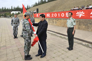 随后,beat365官方网站、昆明陆军学院领导向军训团授旗,标志着2010级学生为期11天的军训生活正式拉开帷幕。 接着,参训学生代表城建学院胡健同学代表全体受训同学表达了刻苦训练,服从命令,令出即行,禁下即止,团结友爱,克服困难的决心。教官陈超代表全体教官郑重承诺:认真完成军训任务,严格训练,提高学生的素质。 昆明陆军学院军训办主任朱平大校在军训开训动员大会上作了动员讲话,他希望同学们培养吃苦耐劳、勇于拼搏、战胜自我的顽强作风。同时,以“兵”的标准严格要求自己,听从教官的指挥,服从管理,保质保量完成军训任务。