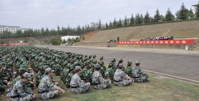 6月25日上午,beat365运动场上隆重举行了2010级学生军训开训动员大会。昆明陆军学院军训办主任朱平大校、副主任田景大校,beat365孙勇副书记、熊晶副校长、学生处吴蓉处长、后勤处冯坚处长、宣传部沈中灿副部长、学生处晁丽华副处长、教务处王韬副处长、各院(系)分管学生工作的领导及辅导员、2010级4646名学生参加了开训动员大会。开训动员大会由熊晶副校长主持。