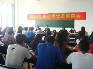 为推进创先争优活动的深入开展,促进机关党总支与数学系党建工作的共同发展, 6月20日下午,数学系党总支与机关党总支在惟真楼2304教室举办了毕业生党员座谈会暨机关党总支向毕业生党员赠书活动仪式,机关党总支书记梁艳萍、数学系主持工作党总支副书记蔡华仙、党总支干事、辅导员、毕业生党员参加了座谈会及赠书仪式。活动由数学系蔡华仙副书记主持。