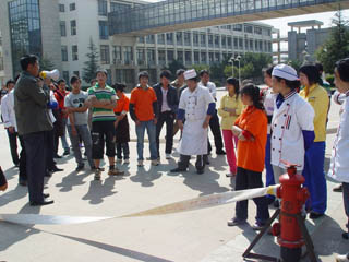 保卫处治安科消防专干祖治亮同志为全体同志作消防知识培训。他介绍了食堂消防栓、灭火器的分布及用途,灭火器的使用方法,食堂常见火灾及处置方法,食堂突发火情的工作预案。讲解贴近实际,语言平实,通俗易懂。最后,全体参训人员齐聚聂耳广场在保卫处人员的详细讲解后,参加了水带连接、火盆灭火的实战演练。