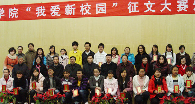 | 12月9日晚,惟行楼1501报告厅欢歌笑语,座无虚席,“我爱新校园”征文颁奖晚会在此举行。学院领导梁晓谷书记、陈世波院长、孙勇副书记、李媛芬副书记以及党委宣传部部长张立新、统战部长张云权、教务处长郝旭霞、学生处长吴蓉、党办副主任陈开祥、文新系党总支书记兼系主任桂彦南、副主任詹七一、副书记姜晓霞、团委副书记钱海鼎、王海艳等各部门领导与200多名师生一起饶有兴致地观看了同学们的诗文朗诵,并给获奖者颁奖。