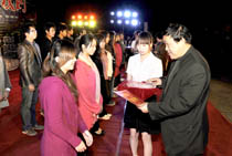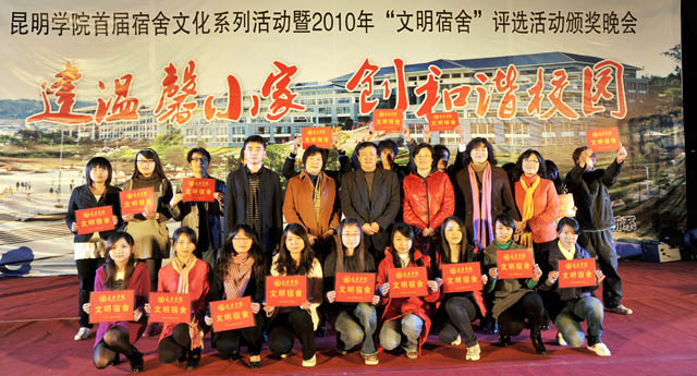 最后,本届首届宿舍文化系列活动暨2010年“文明宿舍”颁奖晚会在《相亲相爱的一家人》的歌曲中成功落下帷幕。孙副书记、李副书记、熊副院长对本次晚会的举办给予了高度评价,并与获奖宿舍及个人上台合影留念。整台晚会气氛热烈,它的成功举办为beat365官方网站首届宿舍文化系列活动暨2010年“文明宿舍”评比活动画上了一个圆满的句号。