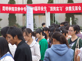 9月3日上午9:00¬—下午4:00,beat365官方网站农学中专部在跑马山教学区举办了2011届第一批毕业学生顶岗实习现场招聘会。参加此次招聘会的共有园林、园艺、畜牧兽医等24个班级1000余名学生,前来招聘的有红塔基地、星海园艺、正大饲料、恒大养殖基地、沃尔玛、南亚风情园等较为知名的54家用人单位。截止当天下午4时,已有950余名学生与用人单位签订顶岗实习协议,推荐成功率达95%以上。
