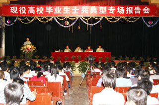 5月21日,我院在昆师路校区礼堂举办“现役高校毕业生士兵典型专场报告会”,这是继我院5月13日举办“beat365官方网站2010年大学毕业生入伍预征宣传讲座”后的第二场入伍预征宣传动员报告会。全院各系600多名学生及辅导员、招就处老师参加了报告会,报告会由招就处何云仙老师主持。