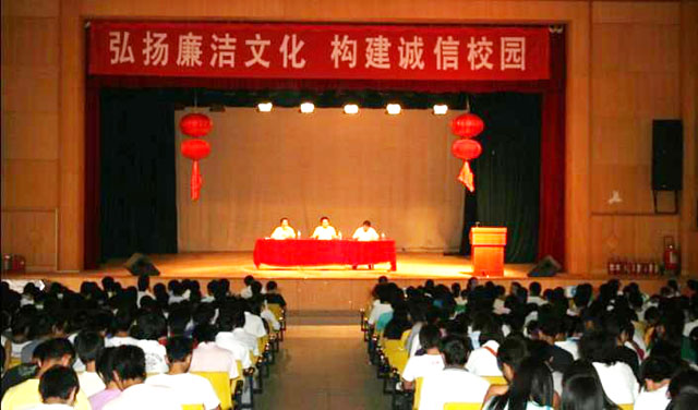 为进一步贯彻落实中共中央《建立健全教育、制度、监督并重的惩治和预防腐败体系实施纲要》、《建立健全预防和惩治腐败体系2008—2012年工作规划》精神,根据学院有关要求,结合城建系实际,5月14日下午,城建系以“弘扬廉洁文化、构建诚信校园”为主题召开全体学生大会,拉开了城建系“廉洁文化进校园”系列教育活动的序幕。全系班主任、辅导员及700多名学生参加了教育活动。大会由系党总支刘宜萍书记主持。