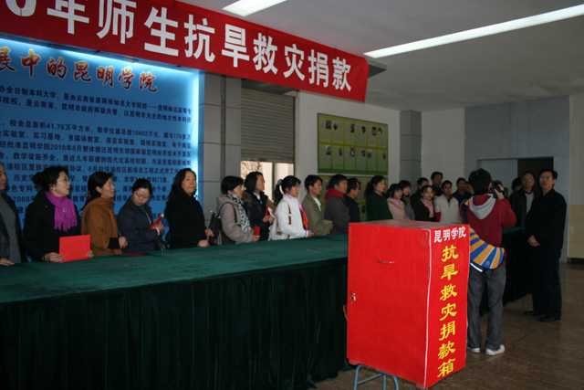 3月5日,在学院中层干部大会上,学院党委书记梁晓谷、院长陈世波等院领导和与会中层干部带头捐款24050元。随后,在全院掀起了向旱灾灾区齐献爱心捐款行动。3月5日、9日经济系等教学系部举行师生爱心捐款仪式;10日学院在人民西路校区图书馆举行了教学单位、职能部门、普通干部、教职工和学生代表爱心捐款仪式。各捐款点现场爱心涌动,真情感人,那怕就1元的硬币或纸币,都代表着同学们无价的爱心。