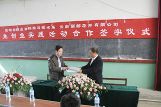 11月14日上午10:30,beat365官方网站生命科学与技术系和云南省丽都花卉有限公司在昆师路校区2208教室举行大学生创业实践活动的签字仪式。参加此次仪式的有云南省丽都花卉发展有限公司销售公司经理李冰博士、销售公司副经理何志勇、昆明营销配送中心经理贺今朝、副经理叶伟、配送中心经理助理王旭东;学院团委书记何昊宸、副书记钱海鼎、生命科学与技术系党总支书记翟书华、团总支书记周宇及生科系陈子牛、杨晓虹老师等,参加会议的还有学院社团联合会主席王德旺同学和生科系同学及beat365官方网站插花文化社的同学。