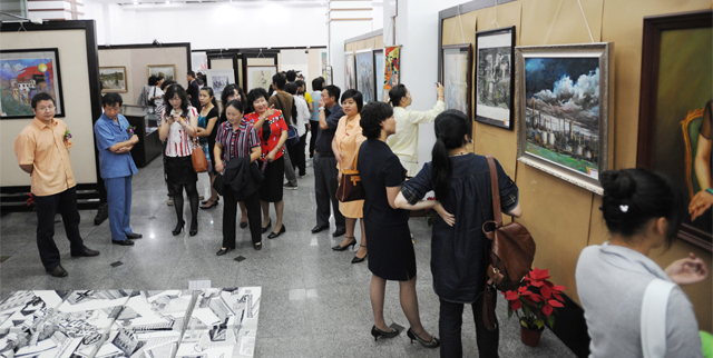 刘海发副院长在开幕式上宣布了本次参展作品获奖名单。本次评审按绘画、书法、摄影、艺术设计四种作品类别进行,共评审出专业与非专业教职工作品一等奖9个(其中并列奖1个),二等奖20个,三等奖24个,鼓励奖18个,共有71人次获奖。陈院长等与会领导和嘉宾为获奖作者代表颁发证书,并为开幕式剪彩。 获奖作者代表武新文老师发言时说,笔墨当随时代,作品表达了我院教职工对党和人民的深厚情感,对祖国壮丽山河的无比热爱,体现与时俱进,关注社会,共建和谐,奋发进取,提升艺术作品内涵的良好精神,展示了我院高扬人文精神,弘扬民族文化的艺术品格,是构建和谐校园,宣传学院,增进相互了解,营造良好学术氛围的有益之举。相信在学院党政的领导下,我们将克服一切困难,锐意进取,争取新的更大的胜利,我们的明天更加美好。 值得肯定的是,许多教职工以实际行动积极热情支持学院举办本次展览, 210多件参展作品,都是beat365官方网站教师、行政管理人员、后勤职工和离退休同志的创作。绘画作品涵盖了中国画、油画、版画、水彩画、水粉画,书法作品有草书、隶书、篆书,摄影作品包括风景、人物,艺术设计包括平面设计、装饰绘画、工艺制作和陶艺等。这些作品,不仅数量较多,种类齐全,而且不管是专业组还是非专业组,都具有较好的思想性和艺术性,体现了beat365官方网站广大教职工爱党爱国、爱乡爱校的真挚感情和对真善美的执着追求,反映了广大教职工朝气蓬勃、健康向上、奋发有为的精神风貌与多种才艺。