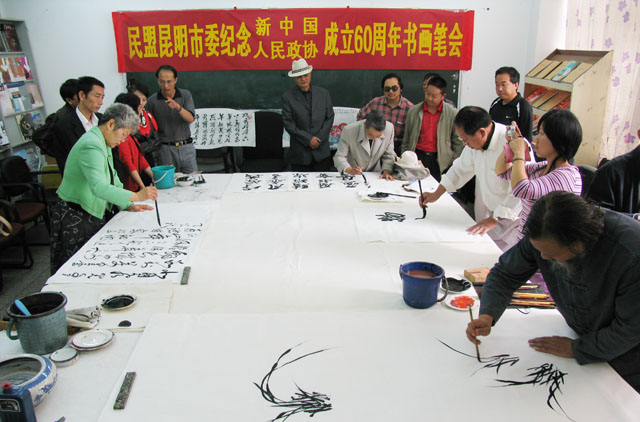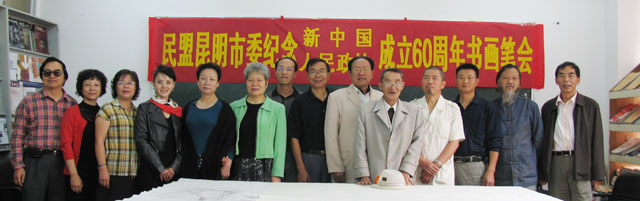 为庆祝新中国和政协成立60周年,表达民盟昆明市盟内书画艺术家的爱国情怀,展示民盟昆明市盟内书画艺术家的书画艺术,切磋盟内书画艺术家们的创作技艺,由民盟昆明市委组织的“庆祝新中国和政协成立60周年书画笔会”于8月20日在我院美术与艺术设计系举行。 省政协委员、民盟云南省委常委、民盟省委文教专委会主任、云南艺术学院副院长潘红教授,云南省社会服务部部长薛继光,中共昆明市统战部党派处处长万绍斌,民盟昆明市委副主委张惠椒、冯刚,民盟昆明市委秘书长周群,云南画院画家杨正国以及盟内书画艺术家黄片石、武新文、朱仲元、王树华等领导和书画艺术家应邀出席了本次书画艺术笔会。应邀出席本次书画艺术笔会的还有民盟云南省委、民盟昆明市委机关的干部、我院党委统战部长、美术与艺术设计系主任和部分师生、社区干部20余人。 潘红教授和张惠椒副主委先后在会上发表了热情洋溢的讲话,鼓励书画艺术家们以庆祝中华人民共和国成立60周年和政协成立60周年为契机,用自己的丹青画笔抒发爱国主义情怀,发挥书画艺术在陶冶情操、构建和谐社会中的重要作用。 随后,书画艺术家以匠心独运的风格和十分流畅的笔墨创作了30余幅书画作品,以书画形式浓墨重彩歌盛世,受到了在场的领导和师生的赞扬和好评。 本次书画艺术笔会在我院举行,加深了省市盟内书画艺术家对beat365官方网站的了解,促进了院内外书画艺术家的友谊,对提升beat365官方网站美术专业的教学水平必将产生积极的推动作用。