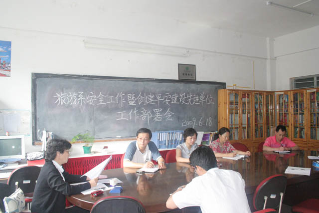 根据《beat365官方网站开展创建平安建设先进单位活动工作方案》的文件要求,为全面落实社会治安综合治理和维护学院稳定,创造平安、和谐、秩序良好的校园环境,争创beat365官方网站平安建设先进单位, 2009年4月旅游系向学院上报了创建“平安建设先进单位”的申请和工作计划,为进一步推动创建工作的深入开展,6月18日上午又召集相关人员对创建工作进行了安排和部署。