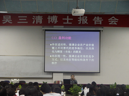 4月24日晚8:00,吴三清博士应邀到我院举行《德鲁克理论之于企业的意义》学术报告会。报告会由经济系主任博斌教授主持,陈世波院长、科学发展观指导检查组包崇疆同志、经济系、旅游系、社会科学与人力资源系的领导和部分教师代表、学生代表参加听报告。