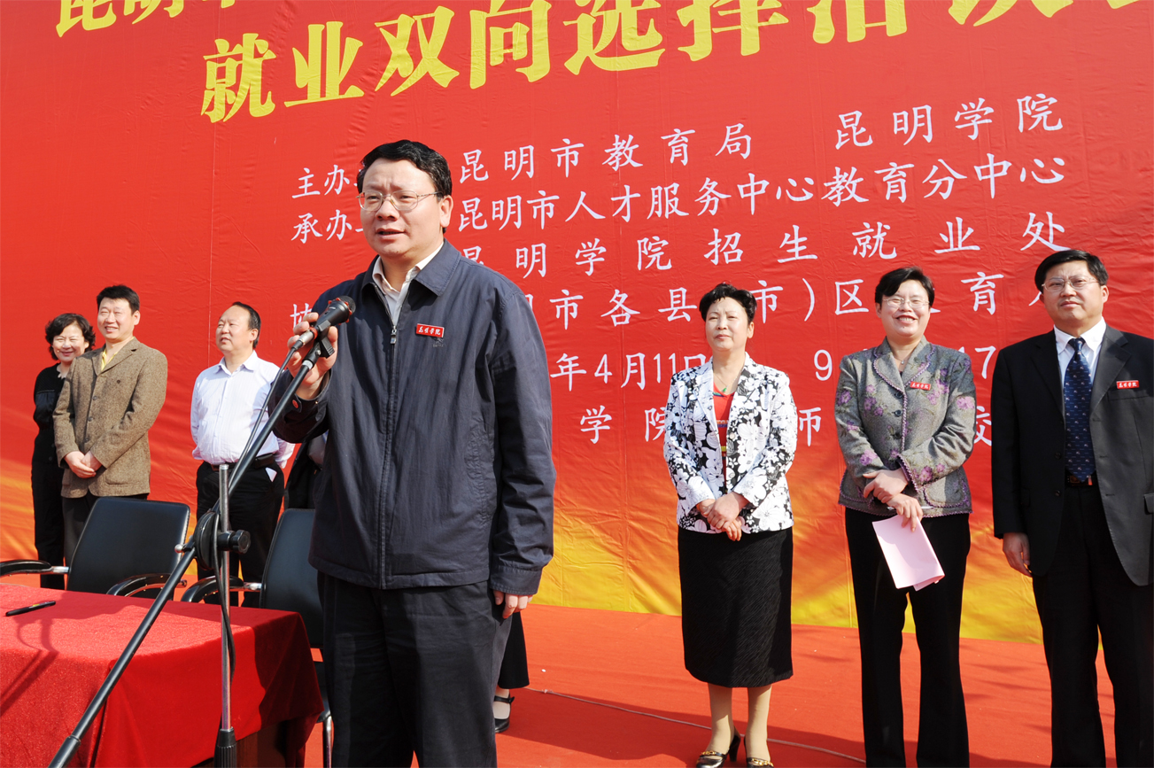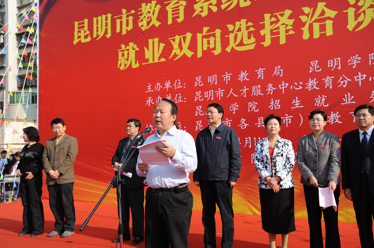 4月11日,由昆明市教育局、beat365官方网站共同举办的“昆明市教育系统2009年毕业生就业双向选择洽谈会”在我院昆师路校区隆重举行。云南省高校工委副书记陶晴,昆明市人大常委会副主任杨丽,beat365官方网站院长陈世波,学院党委副书记孙勇,副院长熊晶、罗明东和省教育厅学生处、省大中专毕业生就业服务中心,昆明市教育局、市人事局、市人才服务中心、昆明市各县(市)区教育局、人才教育分中心等相关部门领导出席洽谈会。