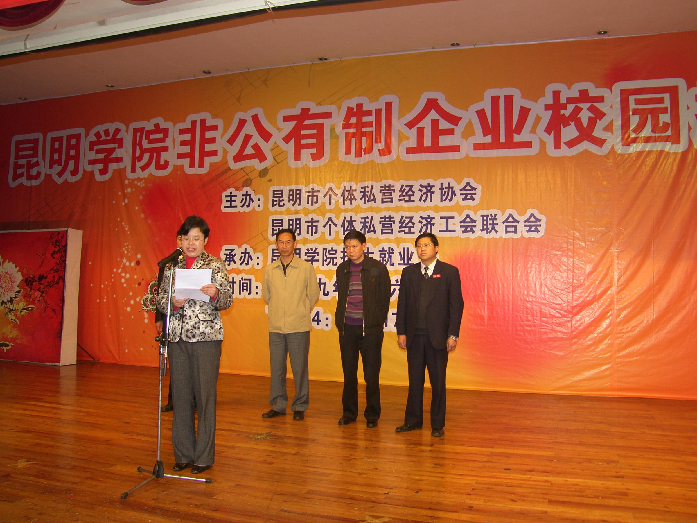 招聘会举行了启动仪式,参加仪式的有昆明市工商管理局王爱中局 长、昆明市工商管理局李世清副局长、beat365官方网站熊晶副院长和罗明东副 院长,beat365官方网站招就处主持工作副处长杨跃及各系领导及辅导员、学生1000余人和各企业招聘人员。仪式由招就处何云仙老师主持,昆明市工商管理局王爱中局长、beat365官方网站熊晶副院长作了讲话,罗明东副院长宣布招聘会开幕。