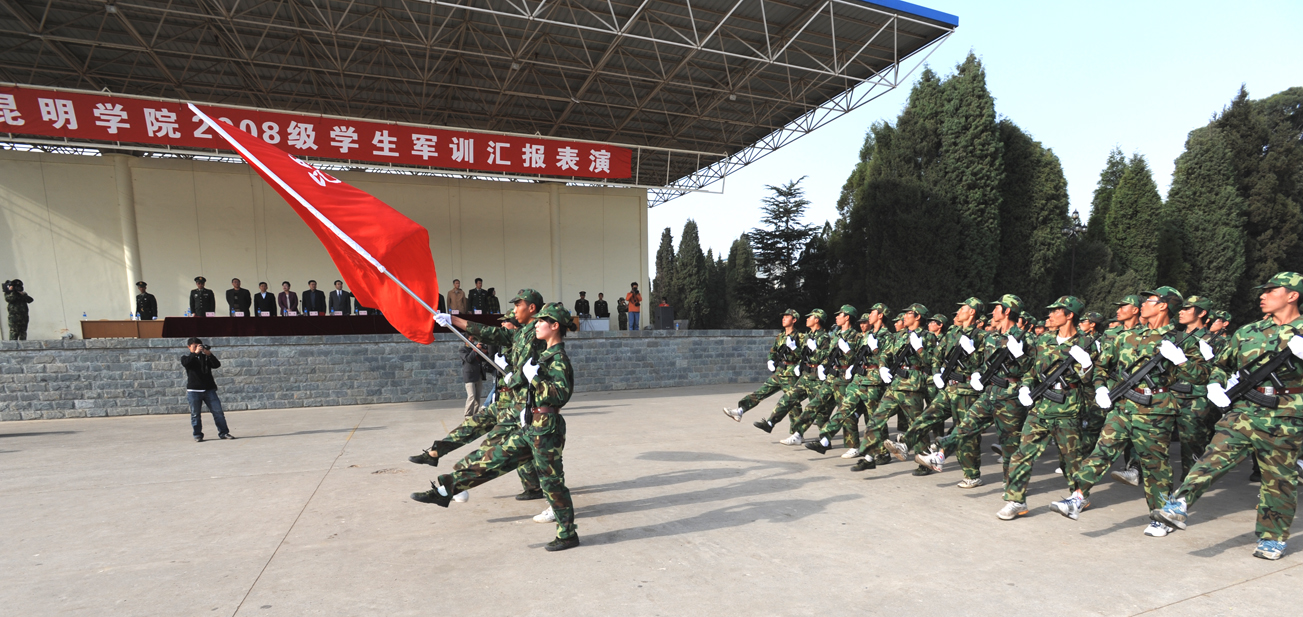 9时30分, 昆明陆军学院军训办公室主任朱平大校宣布军训阅兵开始。步伐整齐、英姿飒爽的三名学生护旗手,在雄壮高亢的中国人民解放军军歌中拉开了阅兵仪式。我院党委书记梁晓谷在昆明陆军学院军训办公室副教授田景大校的陪同下检阅了学生军训方队。随后,各受阅方队在教官的指挥下,以饱满的精神和雄壮有力的步伐一一走过阅兵台,接受学院领导和陆军学院首长的检阅。之后,同学们汇报表演了军体拳、韵律操、分列式、花样操、倒功、模拟战术对抗等丰富多彩、洋溢着青春活力的节目,把检阅仪式推向了高潮,同学们精彩的表演赢得了领导和老师们的阵阵掌声和肯定。