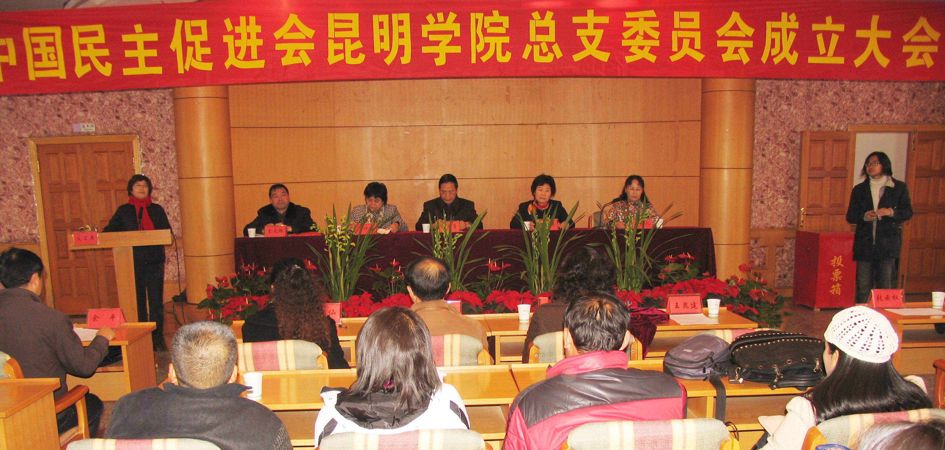 在民进云南省委、昆明市委的领导和beat365官方网站党委的指导下,在民进beat365官方网站全体会员的努力下,2008年12月6日,民进beat365官方网站第一届总支委员会成立大会胜利召开。出席大会我院应到会员70余人,实到会与委托投票会员61人。应邀出席成立大会的来宾有民进省委副主委陈友康、中共昆明市委统战部副部长贾天鹏、中共beat365官方网站党委副书记李媛芬及统战部负责人,beat365官方网站民革、民盟、致公党、九三学社的代表也应邀出席了大会。