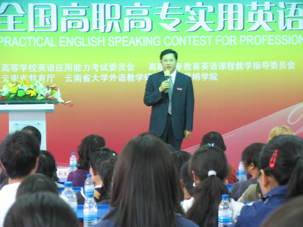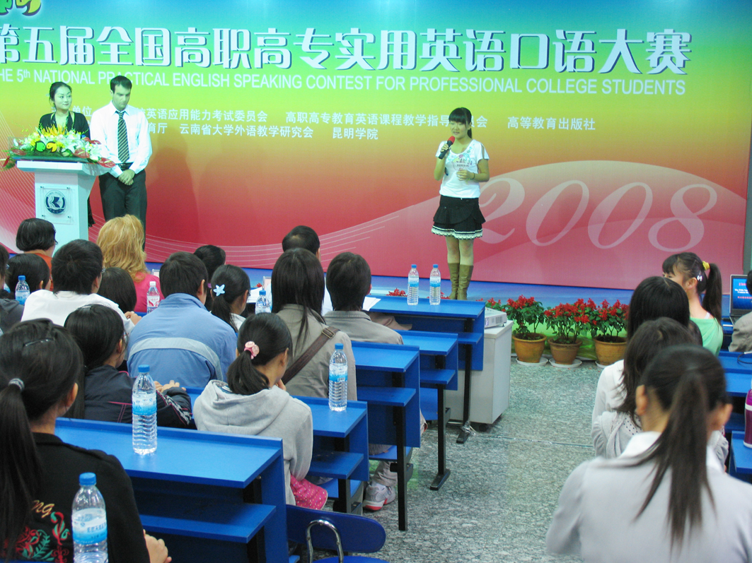 由高等学校英语应用能力考试委员会、高职高专教育英语课程教学指导委员会、高等教育出版社主办,云南省教育厅、云南省大学外语教学研究会和beat365官方网站联合承办的“第五届全国高职高专实用英语口语大赛(云南赛区复赛)”于2008年10月11日上午在昆师路校区隆重举行。出席比赛现场的领导有:省教育厅高教处张国华处长、beat365官方网站罗明东副院长、云南师范大学原一川副校长、云南省大学外语教学与考试指导委员会梁育全主任、云南省大学外语教学研究会杨世强会长、赵安海副会长等;来自全省30所高职高专院校的31名参赛选手分别进行了精彩纷呈的演讲比赛,参赛院校的带队领导、指导教师和参赛选手共200余人观看了比赛。