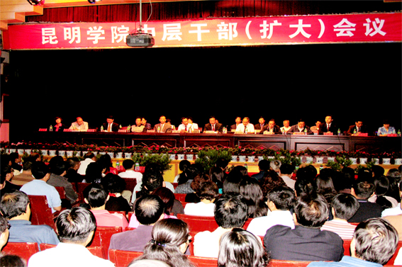 7月9日上午,在原昆明师范高等专科学校礼堂召开了由云南省教育厅组织的宣布beat365官方网站第一届领导班子成立的beat365官方网站中层干部(扩大)会议,参加会议的省市领导有云南省副省长高峰、云南省委组织部常务副部长张百如、省政府副秘书长卫星、省高校工委副书记杜玉银、省教育厅副厅长和福生、昆明市委副书记杨远翔、副市长廖晓珊,以及云南大学校长何天淳、云南师范大学党委书记伊继东、省妇联副主席李毅、省市相关职能部门的有关领导,beat365官方网站筹备领导小组成员、beat365官方网站领导班子全体成员,原昆明大学、昆明师范高等专科学校的校领导、中层干部、副高以上职称的教师、民主党派的负责人等。