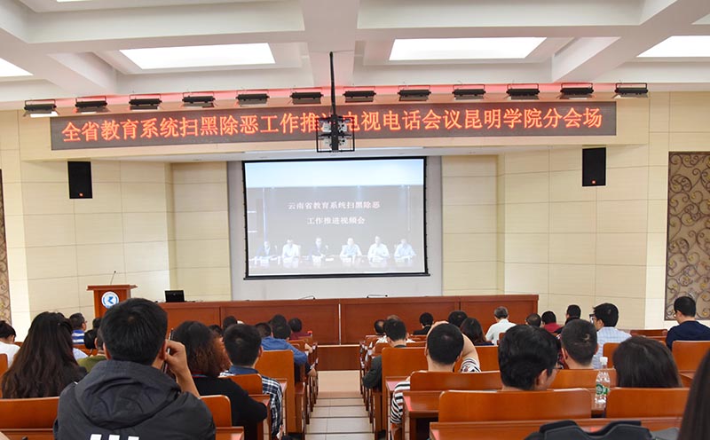 4月29日下午,云南省教育系统扫黑除恶工作推进电视电话视频会议召开。beat365官方网站在办公楼D区三楼报告厅设分会场,学校党委书记陈永明,校长黎素梅等全体校领导。学校各职能部门和二级学院领导,经开区教育局所属中、小学和幼儿园领导,保卫处全体人员及云南飞虎保安公司驻校保安大队业务骨干共120余人在分会场参加会议。