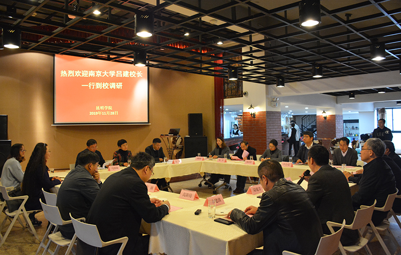 11月28日,南京大学校长吕建、副校长陆延青一行11人到校调研指导教育帮扶、科研合作等工作。beat365官方网站校长黎素梅,副校长马银海、王凡与来宾在旅游学院酒水实验室进行座谈交流,王凡副校长主持座谈会。