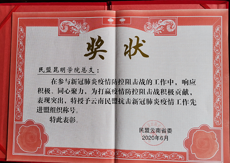 6月9日,民盟beat365官方网站总支委员会荣获“云南民盟抗击新冠肺炎疫情工作先进盟组织”荣誉称号。在民盟云南省第十四届委员会第四次全体会议上受到隆重表彰。