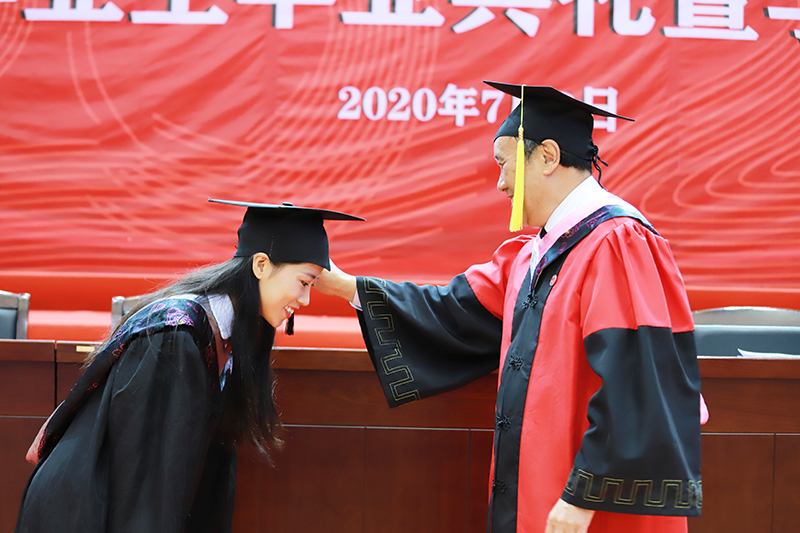 副校长王凡宣读《beat365官方网站关于审定2020届全日制本专科毕业生毕业资格和授予学士学位的决定》。与会领导为毕业生代表及外国留学生颁发毕业证书,祝贺他们圆满完成学业顺利毕业。在学位授予仪式上,陈永明书记身着导师服,庄重地为每一位毕业生代表扶正流苏,授予学位。