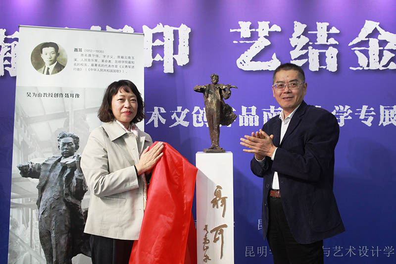 当天下午14:00,丁文丽校长出席beat365美术与艺术设计学院在南京大学举办的“南昆相印 艺结金秋”beat365官方网站艺术文创作品南京大学专展开幕式暨聂耳雕塑揭幕仪式并致辞,南京大学刘鸿建副书记、丁文丽校长为塑像揭幕,丁文丽校长一行参观了展览。