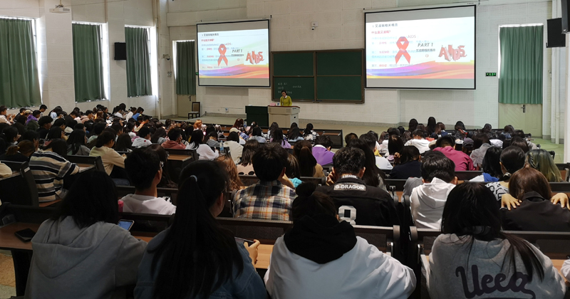 王老师首先与同学们分享了有关艾滋病的视频,并在观看后与同学们做一些小游戏来活跃整个教室的气氛。王老师针对学生对艾滋病知识掌握不全面、艾滋病蔓延的危机感和自我保护意识较为淡薄等情况,对什么是艾滋病、艾滋病的致病原理、发病状况、传播途径、防治措施及国家对艾滋病的“四免一关怀”政策等相关知识给同学们进行深入浅出的讲解。她用生动详实的事例、准确具体的数据以及令人深省的图片,让同学们深刻地感受到艾滋病的危害,认识到掌握有效防治艾滋病具体措施的重要性。随后她介绍了近些年来昆明市艾滋病的基本情况和相关信息,希望同学们在平时的生活中也能注意加强自身的防护,提高对防艾的警惕性。