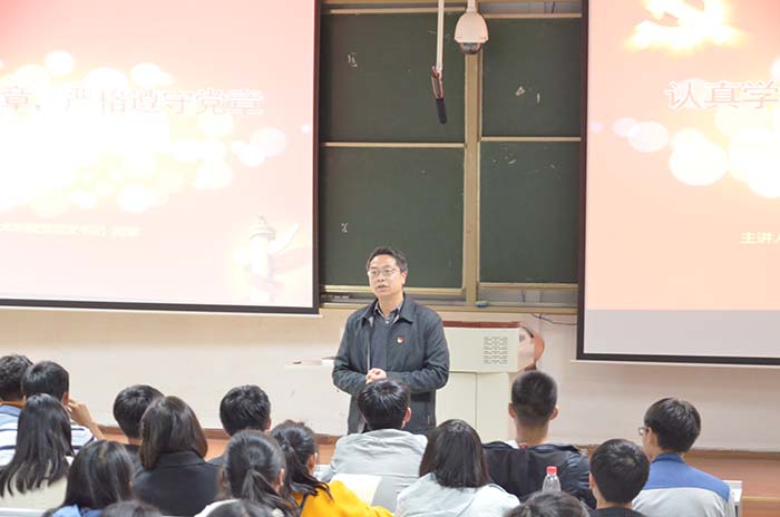 随后,陶军结合自己二十多年前申请入党、参加党课培训的经历和同学们分享了申请入党、学习党章的心得和体会,并从学习《中国共产党章程》的四个重大意义诠释了“为什么学”;围绕《中国共产党章程》的主要内容从面上和点上解读了“学什么”;从解答如何深入学习《中国共产党章程》来分析了“怎么学”,从如何学以致用践行《中国共产党章程》回答了“怎么做”。 最后,他强调党章是党的活动和党的建设的百科全书。学习贯彻党章达到知行统一,既是一个理论问题,更是一个实践问题,每一个入党积极分子和申请入党同学都应自觉地以此为价值取向、行为准则和终身课题常修常学。他要求大家要逐条逐句通读党章,全面理解党的纲领,牢记入党誓词,牢记党的宗旨,牢记党员义务和权利,自觉尊崇党章、遵守党章、维护党章,讲党性、重品行、作表率,不断加强党性修养,敢于坚持原则,勇于开展批评和自我批评,带头弘扬正气、抵制歪风邪气,团结同学坚定信念、执著追求、勤奋学习,努力实践,提高本领,争取早日在思想、行动上、组织上加入党组织。