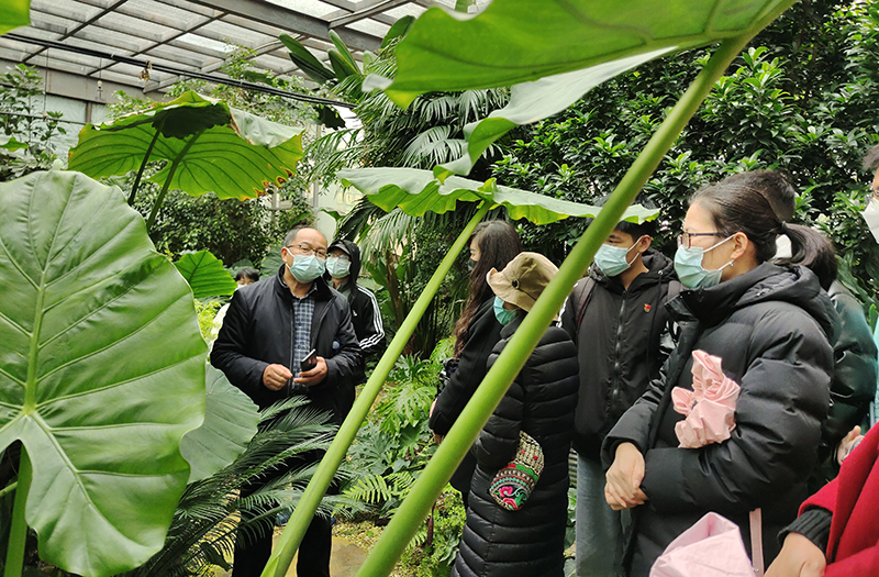 在农学与生命科学学院阳光中庭,翟书华教授为大家讲解种植的云南特色植物的分类、栽培知识;在智慧农业试验基地的草莓大棚里,苏源博士介绍了智慧农业设施和发展前景。