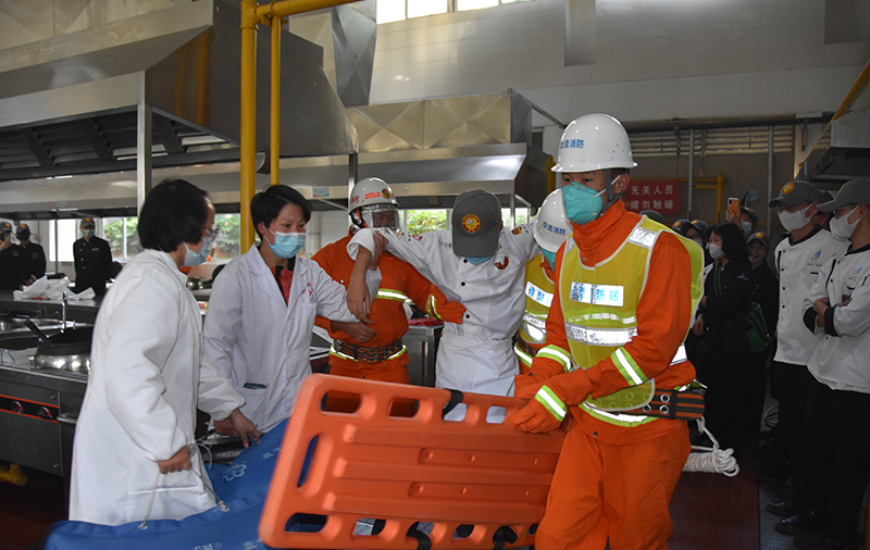 在燃气泄漏应急疏散演练中,模拟厨房操作间突然发生燃气泄漏,现场师生果断迅速报警。接到报警后,校园义务消防员、保安队员、消防维保人员、校医院医务人员协调联动,密切合作,快速到达事发现场,疏散人员快速引导、疏散被困学生,医护人员转运昏迷人员离开燃气泄漏现场,并开展紧急救治。