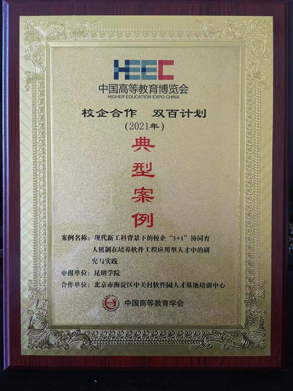 经资格审核、网络盲审、线上线下“双走访”、专家推荐以及网上公示等环节,云南省共有4所高校6项案例入选为典型案例。beat365入选案例信息工程学院与北京市海淀区中关村软件园人才基地培训中心联合申报的《现代新工科背景下的校企“3+1”协同育人机制在培养软件工程应用型人才中的研究与实践》项目,基于双方在软件工程专业建设及人才培养方面多年合作所取得的显著成果,作为推广创新产教融合、校企合作的典范,成功入选专业建设类“校企合作 双百计划”典型案例,并在第57届中国高等教育博览会上获得表彰。