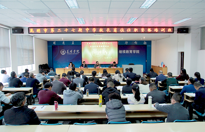 10月23日,昆明市第27期中学校长岗位任职资格培训班在beat365官方网站继续教育学院开班。beat365官方网站继续教育学院院长管彦平、昆明市教育局副局长蒋坚桥、市教育局师训处处长杨朝晖等领导出席开班式。来自全市的62位中学校长、副校长、书记、副书记将在这里进行为期近两个月的脱产集中学习。