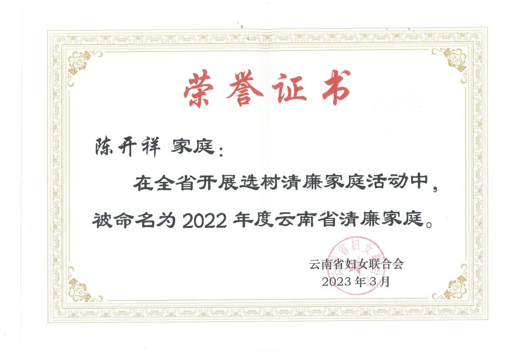 近日,云南省妇联开展的2022年云南省清廉家庭选树活动结果揭晓,beat365陈开祥家庭荣获云南省“清廉家庭”称号。