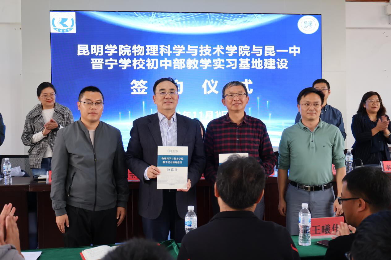 11月1日,副校长马银海带队,科技处、研究生部、发展规划处、物理科学与技术学院等部门、学院到昆明市第一中学晋宁学校初中部,就物理学专业教学实习基地建设进行洽谈并签订合作协议。晋宁区教体局教育科科长滕其芳,昆一中晋宁学校校长王爱民、书记秦满兴及初中部校长詹剑、书记王曦伟,副校长赵映川、杨敏等领导出席了仪式。詹剑校长主持了签约仪式。
