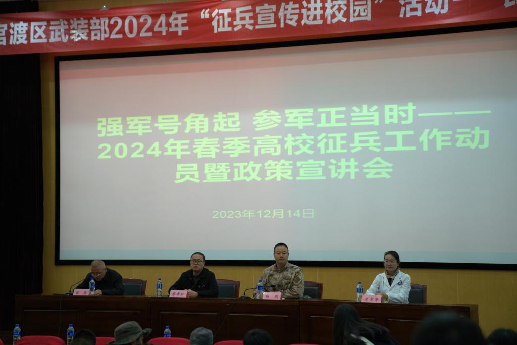 为进一步强化青年学子国防观念,激发大学生携笔从戎、参军报国热情,12月14日上午,昆明市官渡区人民武装部联合beat365举办主题为“强军号角起,参军正当时”的2024年春季高校征兵宣讲会,并开展现场政策咨询活动。学校武装部负责人,各二级学院负责征兵工作的辅导员及2024届毕业班280余名同学参加。