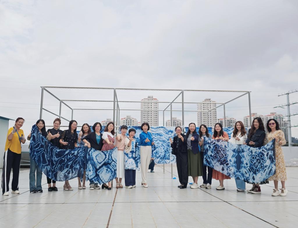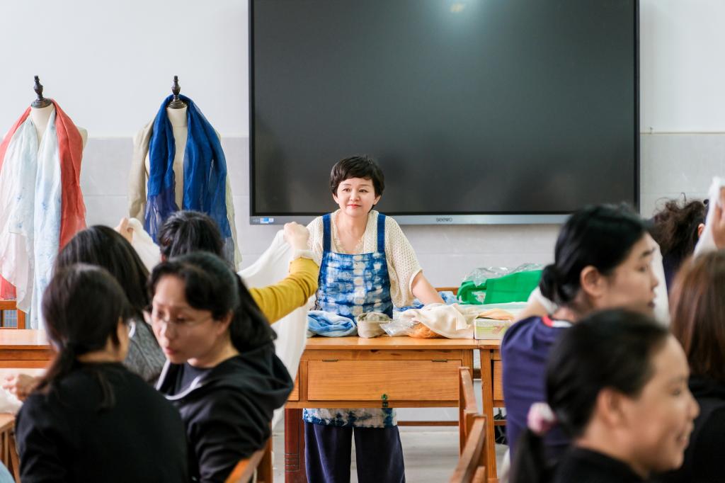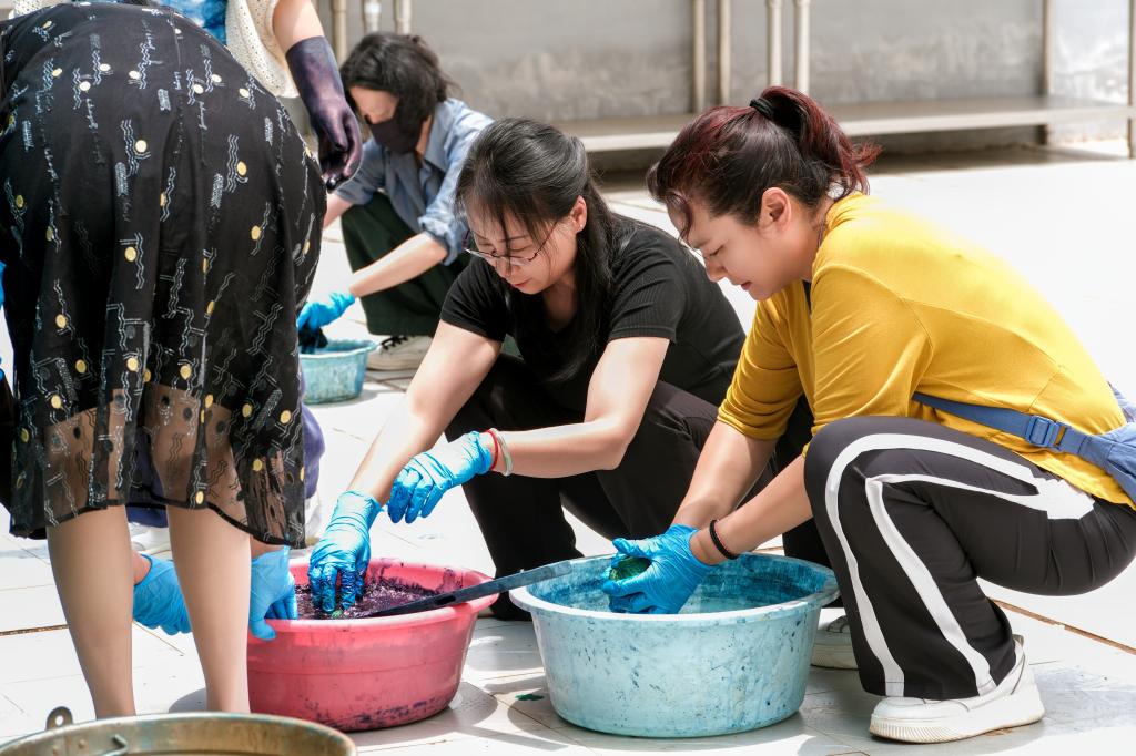在美术与艺术设计学院扎染实验室,专业教师为老师们详细介绍扎染的历史渊源、文化价值、技艺特点以及制作流程。大家自己动手体验,发挥想象力和创造力,认真扎结和染色,一幅幅色彩斑斓、独具特色的扎染作品在手中诞生。