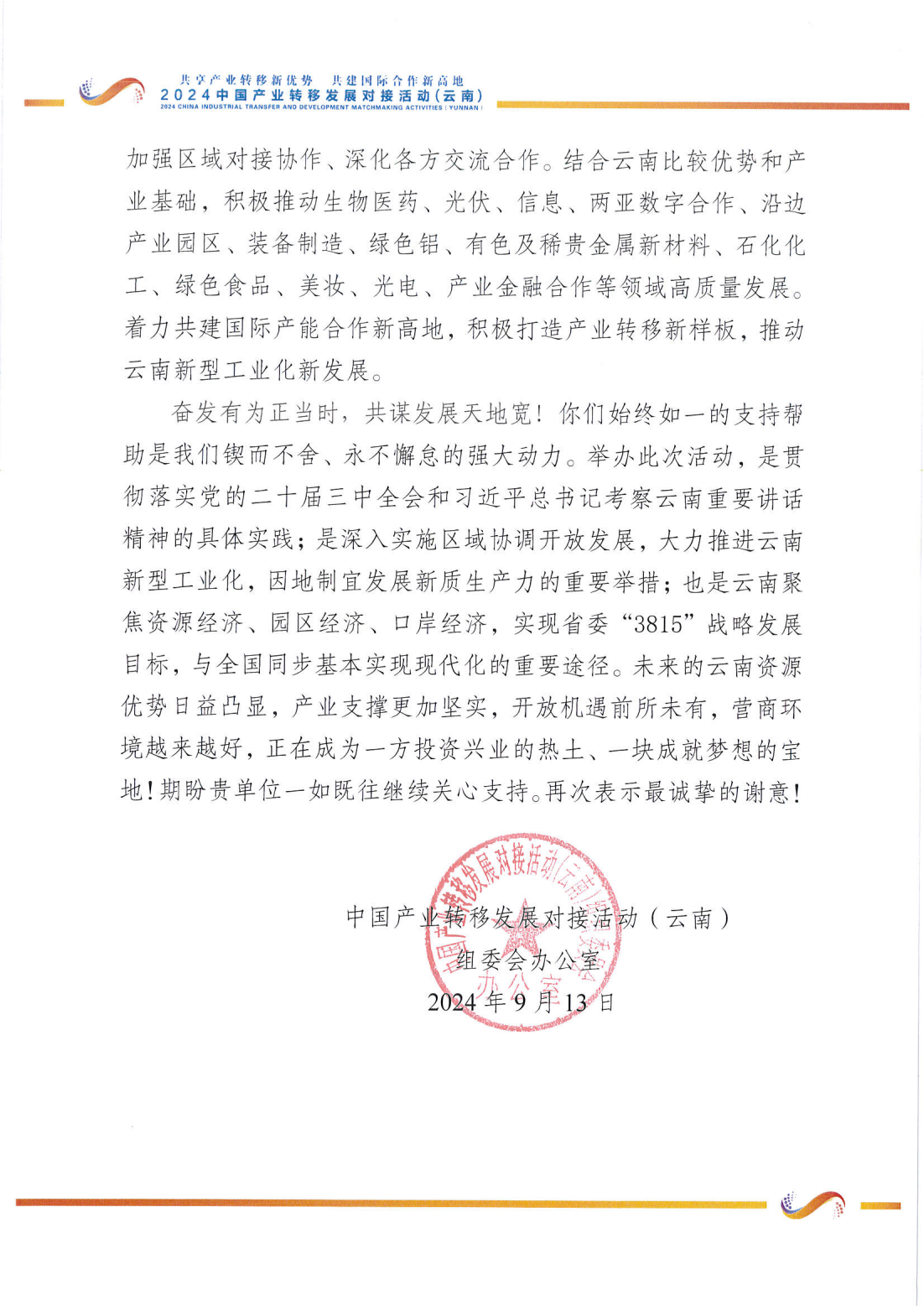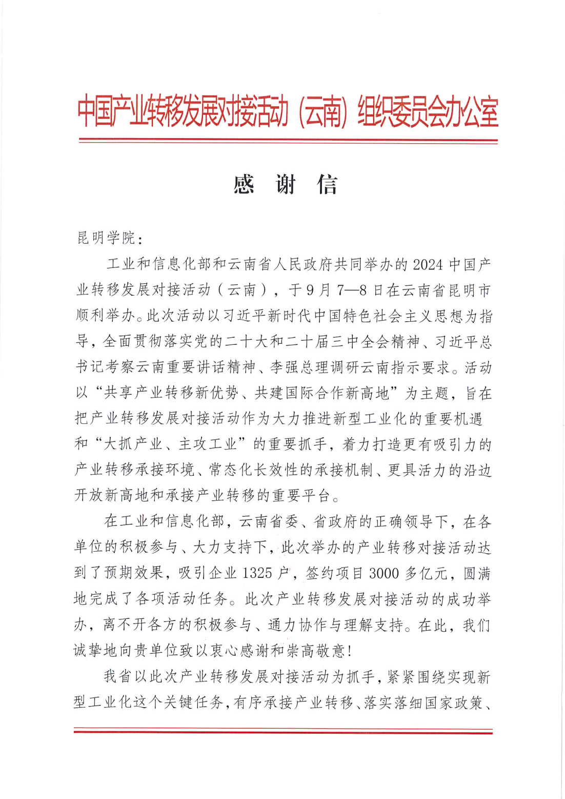 近日,beat365官方网站收到中国产业转移发展对接活动(云南)组委会办公室发来的感谢信,就学校在活动举办过程中给予的支持和帮助表示衷心感谢。