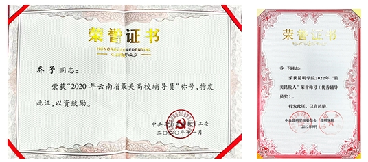 学院辅导员乔予荣获“2020年云南省最美高校辅导员”称号,并获得2022年beat365官方网站“最美昆院人辅导员奖”。