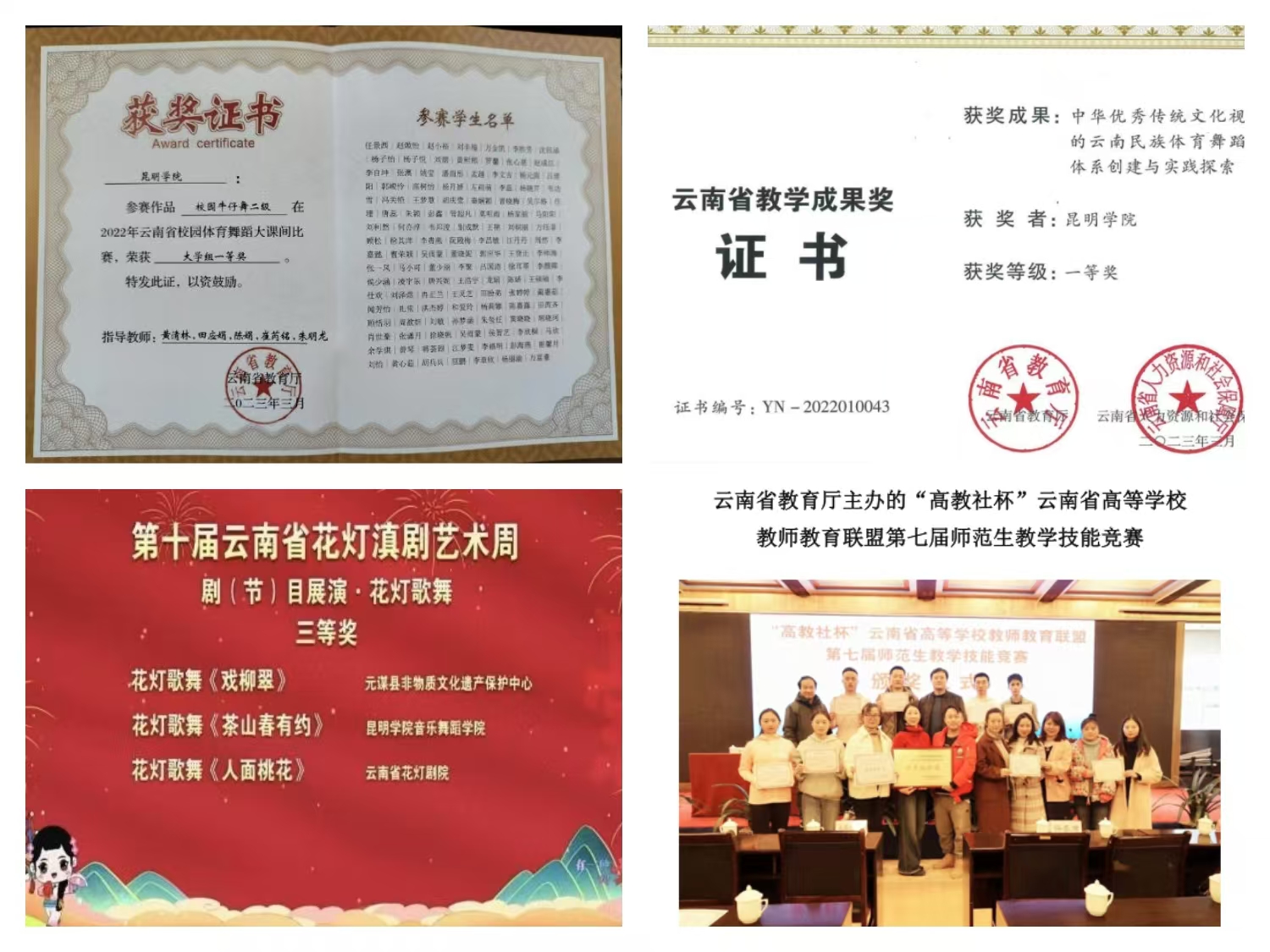 学院积极拓展与专业院团、中小学等企事业单位联合培养的力度,不断提高人才培养与经济社会发展的契合度。运用民族艺术资源,以研促教,提升师生实践创新能力。融合学院教学与民间口传模式,通过理论与实践、课堂与田野的融合,建构新的民族音乐人才培养模式。学院获云南省教学成果奖一等奖、中国大学生体育舞蹈锦标赛团体总分第一名、第16届省运会大学组体育舞蹈专业组团体总分第一名。学生每年在全国、全省音乐舞蹈专业比赛中均取得优异成绩。