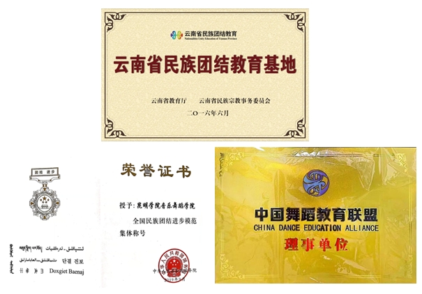 学院先后被授予云南省学生体育协会体育舞蹈专业委员会负责单位、云南省体育舞蹈专业高考统考点、中国大学生体育协会体育舞蹈分会主席单位、云南省民族团结教育基地、全国民族团结进步模范集体等荣誉称号。2018年中央财政支持地方高校项目“云南跨境少数民族歌舞乐数字化保护与传承基地”获批立项;2021年与文旅部文化艺术发展中心共建“云南美育素质教育研究院”。