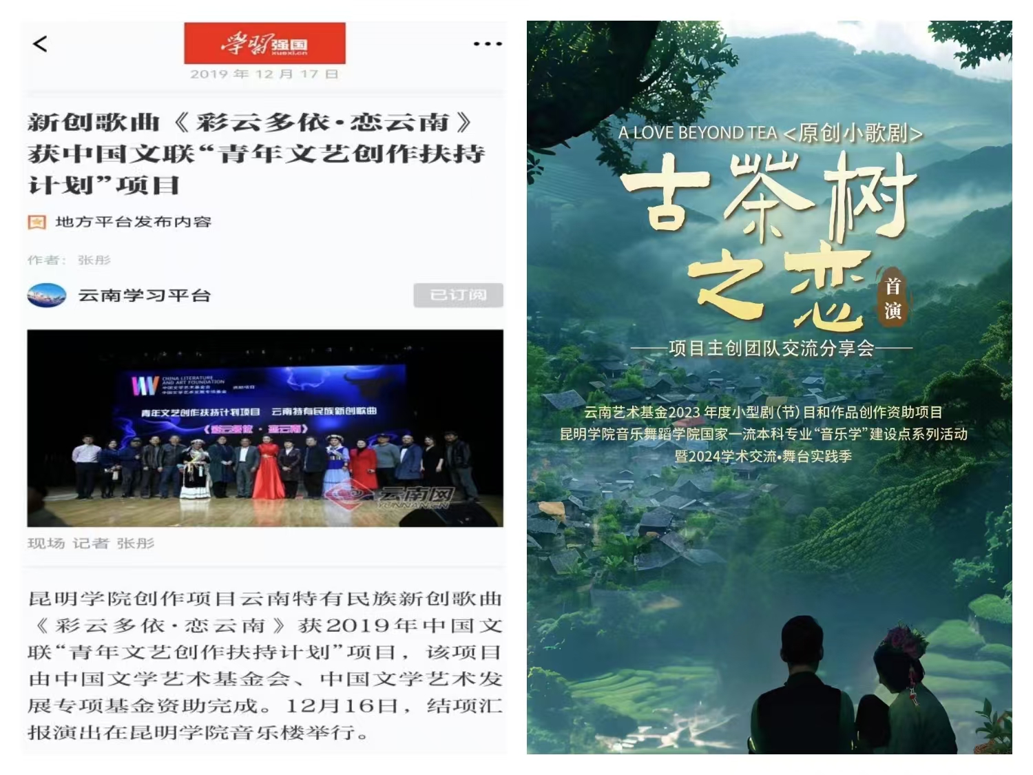 学院注重学科交叉,充分利用云南民族文化资源开展科研和创作。近五年来,学院建设云南跨境少数民族歌舞乐数字化保护与传承基地(510万元),引入横向项目经费100多万元,承担国家艺术基金等高层次人才培养项目(120万元)、云南艺术基金项目(89万元)、云南省民宗委云南世居少数民族文化精品工程体育舞蹈课题等各级各类项目40多项。获批中国文联青年文艺创作扶持计划项目,打造了大型音乐情景剧目《青春华彩—校友聂耳作品展演》、省级艺术创作资助项目《小歌剧—古茶树之恋》、省级文艺精品创作专项重点扶持项目《阿佤人民再唱新歌》、市文艺精品创作扶持项目、创编的校园体育舞蹈5个作品和民族体育舞蹈8个作品被纳入中国大学生体育舞蹈专委会及云南省教育厅的体育舞蹈教师培训教程、比赛项目及中考体育特色加分项目等。