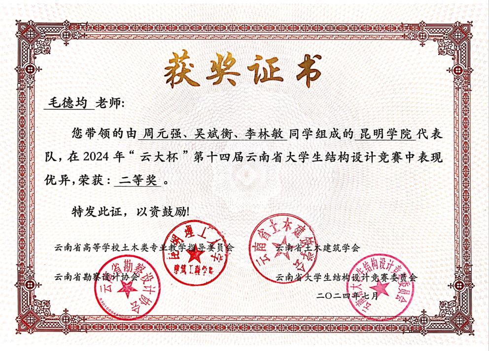 学院现有的四个本科专业综合评价等级均为C(达到国内平均水平),土木工程专业评价排名位列云南省第3/17;水利水电工程专业排名位居云南省第3/6;建筑学专业评价排名位列云南省第6/11;工程造价专业评价排名位列云南省第2/9。