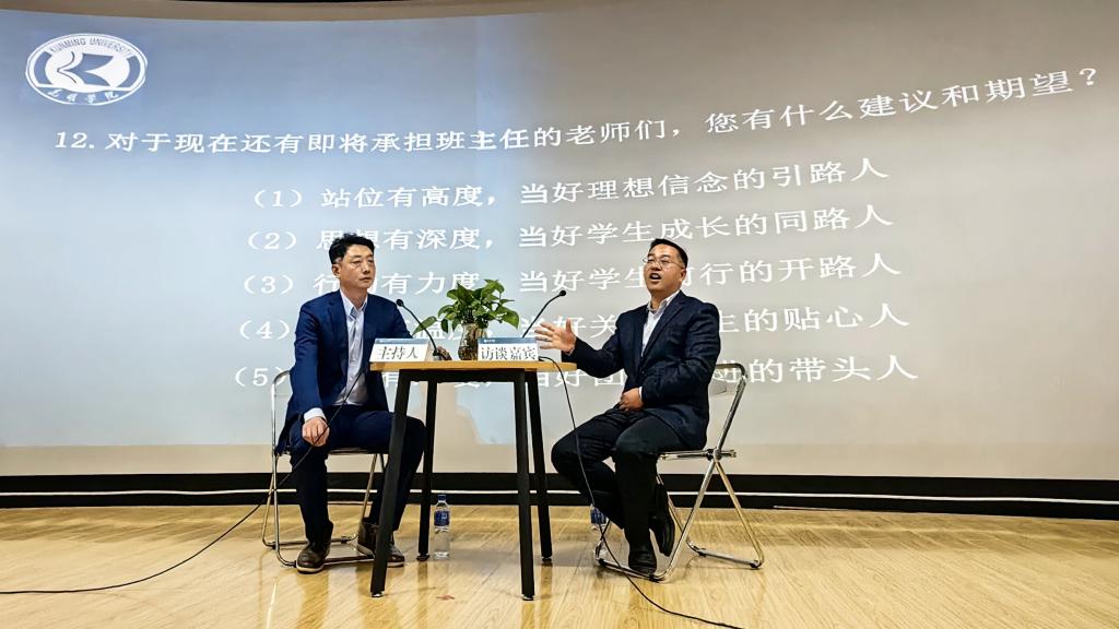 访谈过程中,刘兴全就学生工作认知、工作思路和具体方法、学生工作重难点、日常思政教育方法、心理健康教育、学风建设、服务学生等多个方面与主持人进行了交流分享,对beat365辅导员和班主任们提出了工作意见和建议。参训老师就辅导员、班主任工作定位、具体工作案例等内容与刘兴全老师进行了热烈讨论。