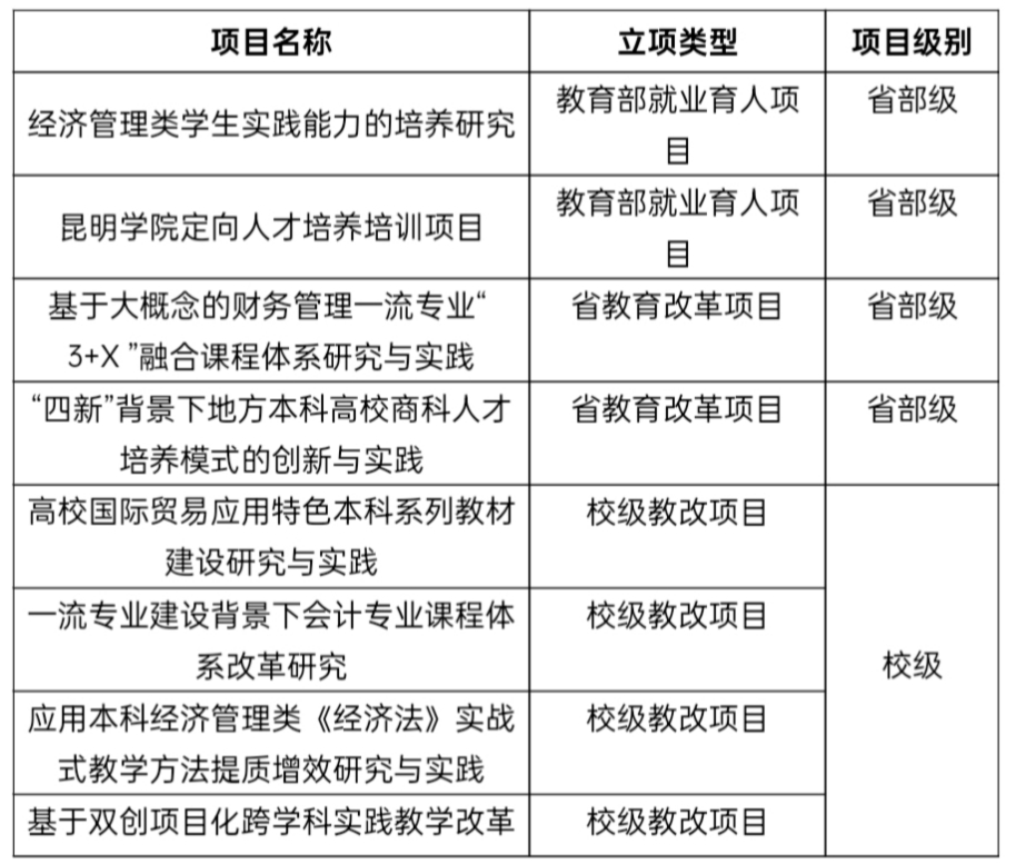 学院现有教职工75人,博士、硕士占比超过90%,高职比例为41%,入选“云岭学者”“省学科带头人”“兴滇英才支持计划”“省级最美班主任”称号各1人,“三区人才”2人。有12名教师具有行业、企业一线工作经历,有30名教师具有美国注册管理会计师、注册国际商务师、中高级会计师、中高级经济师等资格证书,被学校认定为“双师型教师”,形成了一支理论功底扎实、专业能力深厚、教学经验丰富,既潜心研究又具有开拓创新精神的教育教学团队。