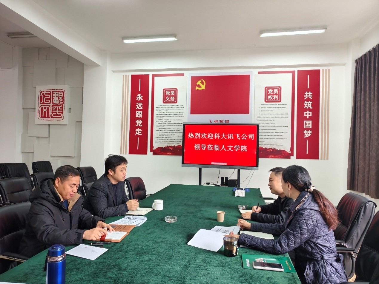 12月23日,人文学院党委书记王海艳一行应邀参观科大讯飞云南公司人工智能展厅,亲身体验了科大讯飞在人工智能领域的前沿AI技术,从智能语音识别到机器翻译,从教育辅助工具到课程建设解决方案,从讯飞星火大模型到讯飞开放平台等。随后双方进行了座谈,对数字人文实习实训基地建设、科研项目合作、课程建设、普通话实验室和四、六级、考研合作、数字人文实验室建设、数字技术支撑等多个方面的合作达成了合作意向。