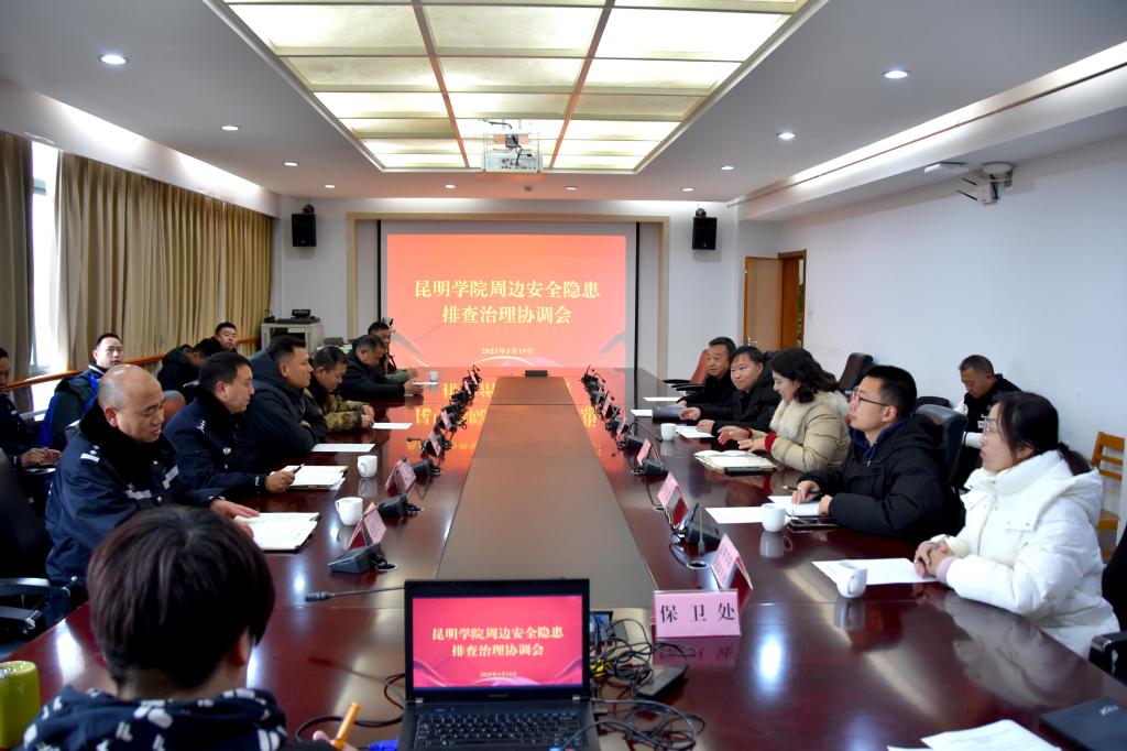 交警七大队、经开区社会事务局、经开区城市管理局、经开公安分局治安大队、昌宏路派出所、官渡区阿拉街道、官渡区小板桥街道相关负责人,学校党委委员、副校长彭志远,保卫处、学生处、附属幼儿园的相关负责人参加了本次会议。
