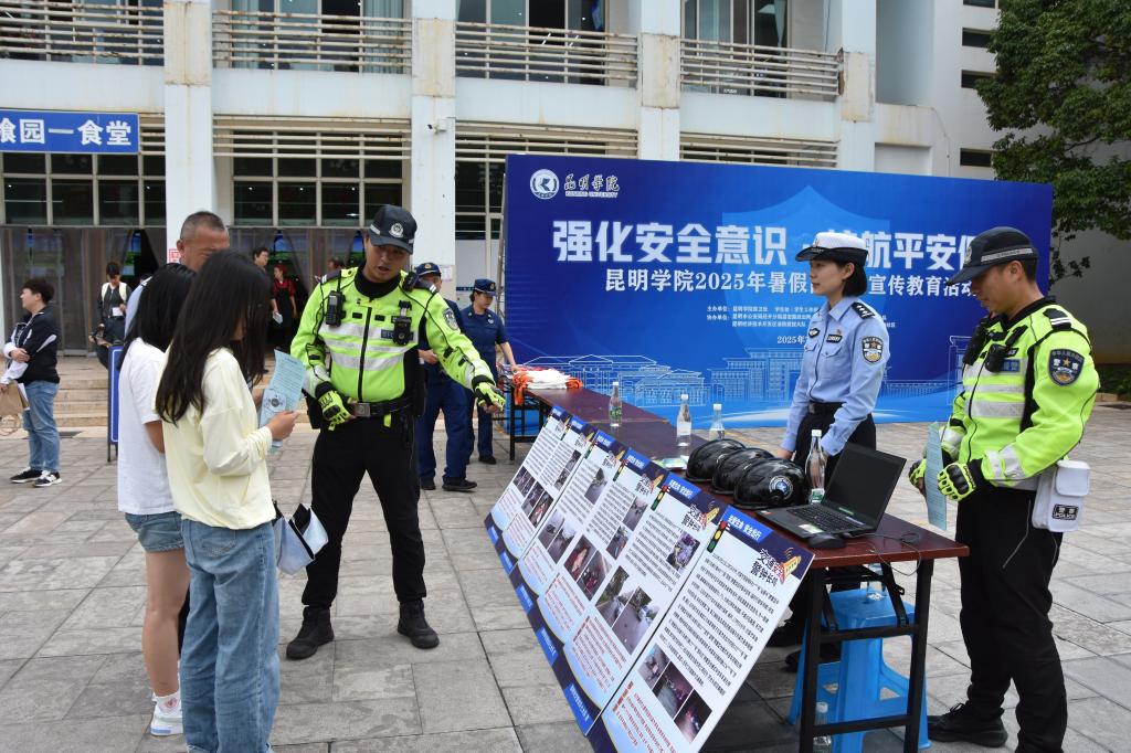 7月8日上午,保卫处、学生处、后勤管理中心联合昆明市公安局交通管理支队七大队、经开区消防救援大队、经开公安分局昌宏路派出所、阿拉街道办事处及云知社区,举办beat365官方网站“强化安全意识·护航平安假期”2025年暑假前安全宣传教育活动。