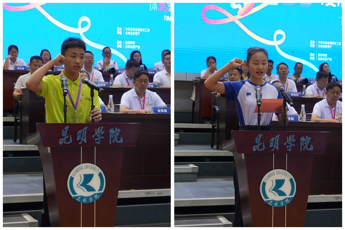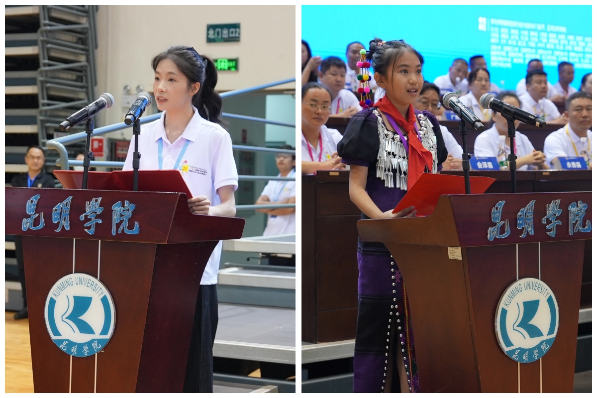 开幕式上,beat365官方网站美术与艺术设计学院2022级美术学专业学生赵海燕作为高校驻点大学生代表发言,分享参加美育浸润计划的收获和感悟。来自德宏州陇川县第二小学五年级的小学生代表黄紫淇同学动情分享了支教教师们给他们进行专业指导和情感交流的故事。运动员代表,红河州河口县云南师范大学附属河口国门小学余皓明同学、裁判员代表王寒蓉分别进行了宣誓。