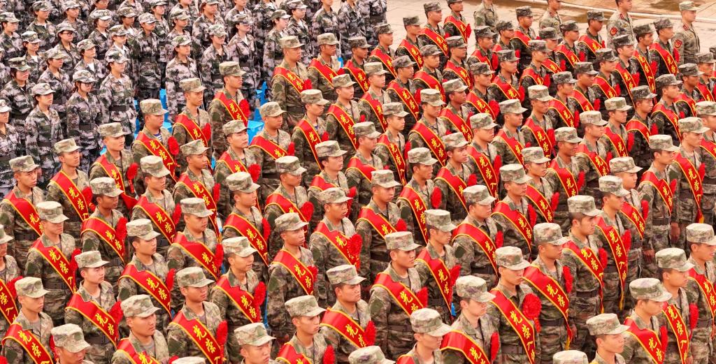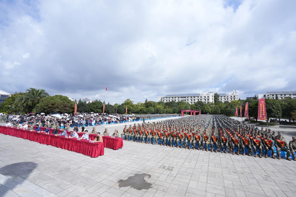 聂耳广场上,军歌嘹亮,军姿飒爽,身着迷彩服参加军训的新生和即将出征的新兵整齐列队。官渡区人武部上校部长曾宪华宣读新兵入伍命令,新兵代表、接兵部队代表和新兵家长代表分别发言,全体新兵进行了集体宣誓。